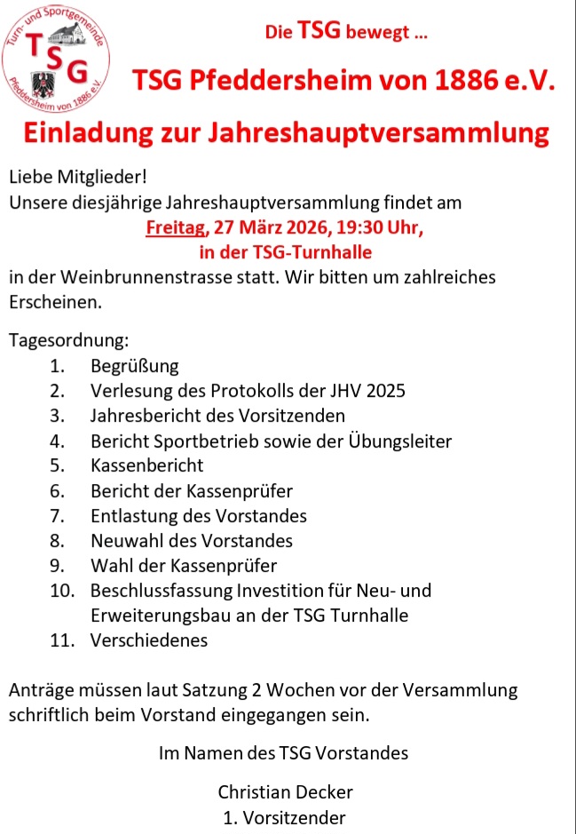 Jahreshauptversammlung der TSG Pfeddersheim von 1886 e.V. Beitrag veröffentlicht:8. März 2026 Beitrags-Kategorie:Aktuelles Das könnte dir auch gefallen 🏃♀️ Übungsleiterin gesucht – Frauengruppe 50+ 🧘♀️ 18. Januar 2026 TSG goes digital – WhatsApp Kanal 5. Januar 2025 Kinderfastnacht bei der TSG Pfeddersheim von 1886 e.V. 18. Januar 2026